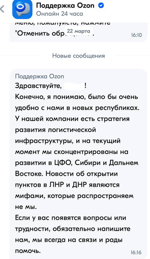 В то же время в технической поддержке маркетплейса Ozon заявляют, что пока о намерении открыть ПВЗ на территории ЛНР и ДНР речи не идёт, и все новости по этому поводу они называют «мифами».