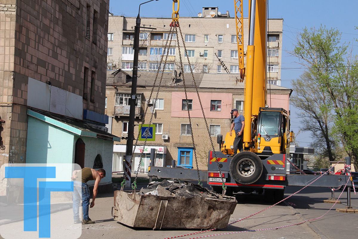 С крыши плавно опускалась металлическая емкость – внизу монтажник принимал строительный мусор, который впоследствии загружался в подошедший грузовик.