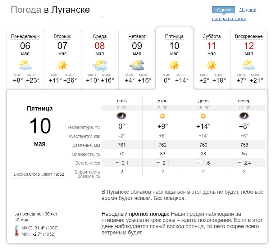Согласно вероятного прогноза погоды, в четверг, 9 мая, и ещё несколько дней после температура воздуха опять пойдёт на снижение - ночью ожидается до +4°C, 10 мая столбик термометра и вовсе может упасть до 0°C (а может быть и ниже, об этом ближе к указанной дате дополнительно сообщат синоптики). Потепление в ЛНР стоит ожидать уже с 12 мая.