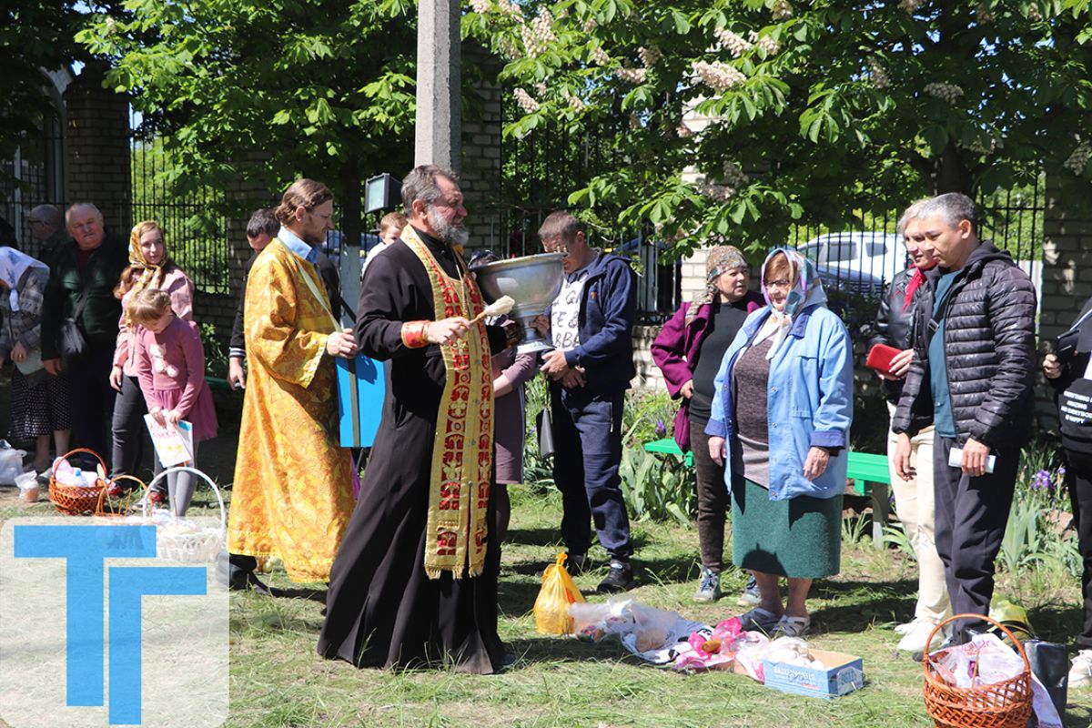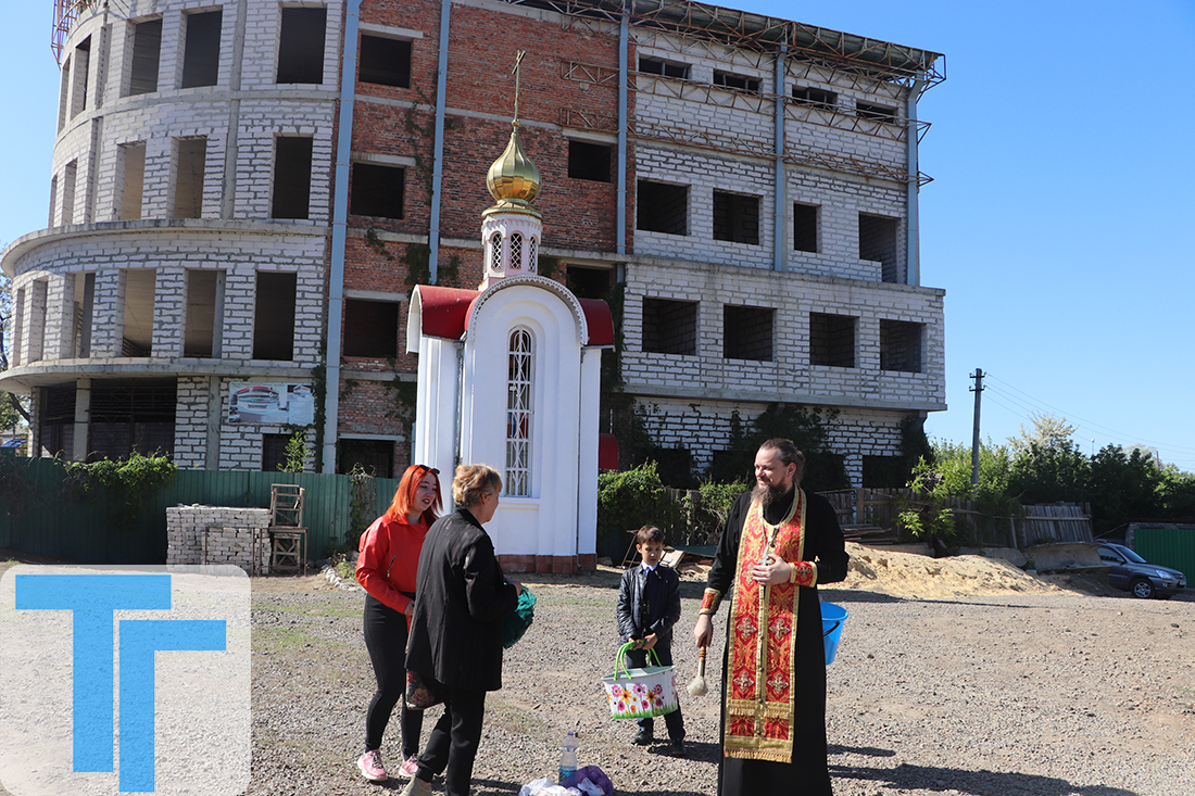 Вереницы людей продолжали стекаться к строящемуся новому зданию Свято-Благовещенского храма даже в десять утра, чтобы поставить свечу во временном подвальном помещении и освятить куличи и другие продукты во дворе, перед часовней Георгия Победоносца. Святой водой верующих окроплял отец Алексей, который в эту Пасху оказывал помощь в богослужении отцу Димитрию.