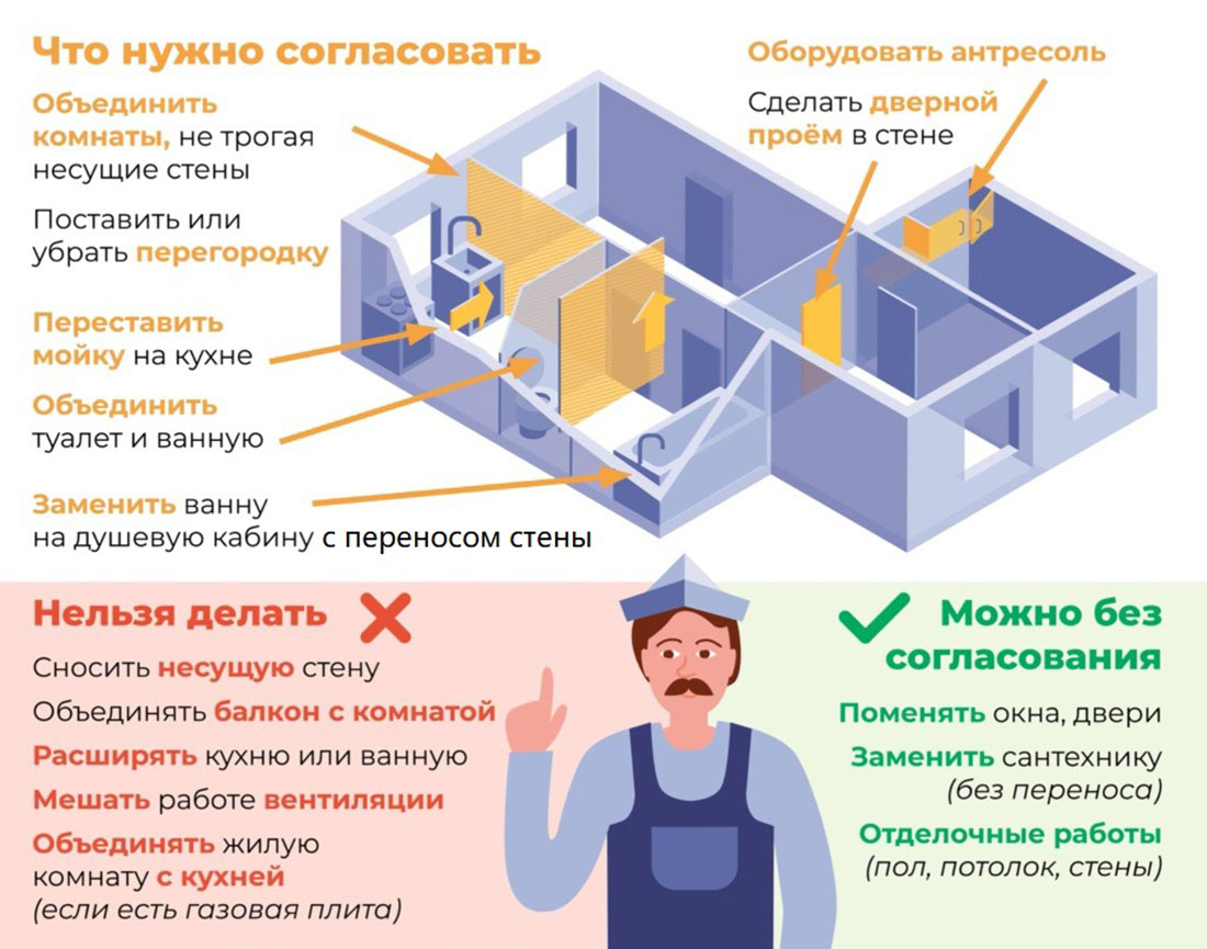 Согласовывать ее нужно будет при увеличении или уменьшении площади квартиры, выделении нового помещения – к примеру, кладовой или гардеробной, изменении границы помещения, внутренней планировки. Без согласования теперь нельзя демонтировать встроенный шкаф или перенести дверной проем.