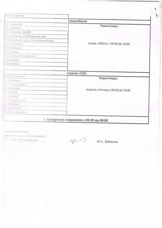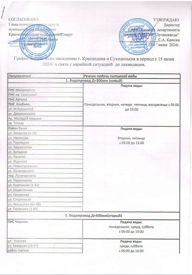 «В связи с аварийной ситуацией на Широкинской насосной станции Краснодонский департамент филиал ГУП ЛНР “Лугансквода“ утвердил график подачи воды населению Краснодона и Суходольска в период с 15 июня 2024 года до ликвидации аварийной ситуации», – говорится в сообщении.