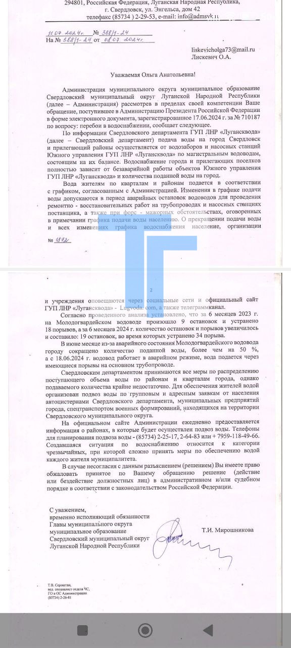 <…> О прекращении подачи воды и всех изменениях графика водоснабжения населения организации и физлица оповещаются через соцсети предприятия «Лугансквода» и месседжер предприятия в Телеграме», - говорится в письме.