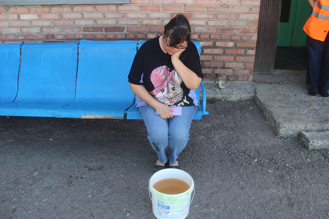В ведре очень мутная вода насыщенного желтого цвета – это остатки запасов, сделанных две недели назад. Даже когда вода на станции идет, ее качество оставляет желать лучшего.