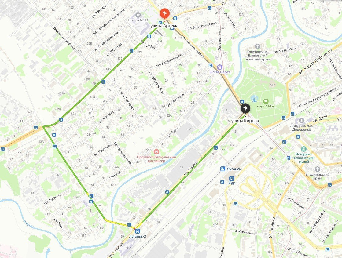 В Луганскгортрансе опубликовали схему объездного маршрута, по которому будет передвигаться городской общественный транспорт после обрушения моста у парка культуры и отдыха имени 1 Мая.