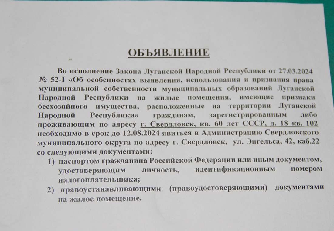 Кажется, что совсем недавно на официальном сайте города прошла информация о том, что принят закон об особенностях выявления, использования и признания права муниципальной собственности муниципальных образований ЛНР на жилые помещения, имеющие признаки бесхозного имущества, расположенные на территории ЛНР. И вот – следующая ступень, по которой на той же платформе стали появляться объявления о поиске хозяев квартир с указанными адресами, имеющими признаки бесхозности.