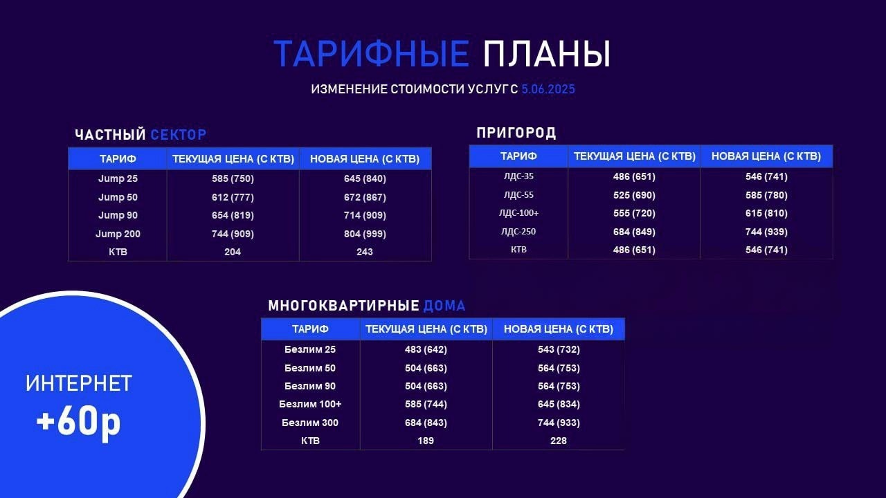 Интернет-провайдер ЛДС информирует пользователей об изменении стоимости тарифов с 5 июня.