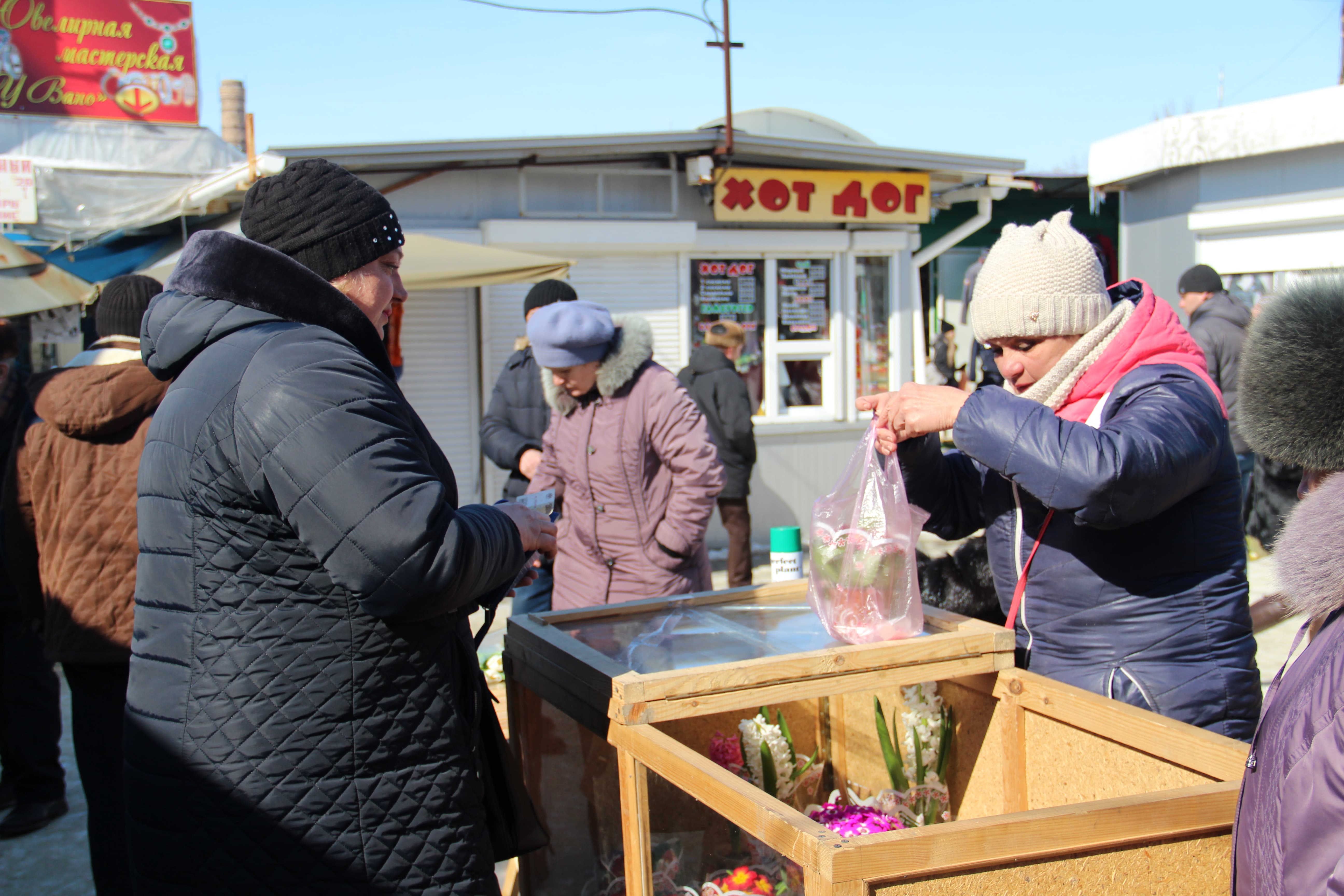 Хотя продавцы считают, что цветы всегда пользуются спросом, и в особой рекламе не нуждаются, но стратегия у них такая: чем больше привлечешь к себе внимания, тем больше шансов продать цветы. Тем более что больше, чем в женский день, покупателей уже не будет в течение года. Так что перед ним нужно работать ударно. Наталья помогает нам завернуть очередной букет с тюльпанами, делится своими многолетними наблюдениями: «В последние несколько лет покупательская способность у свердловчан немного снизилась. Мужчины стали реже баловать женщин цветами. Видимо, к подаркам подходят с более практичной стороны. Сейчас за цветами приходит в основном молодежь, но если они предназначаются на презенты для предприятия, то женщины чаще покупают.