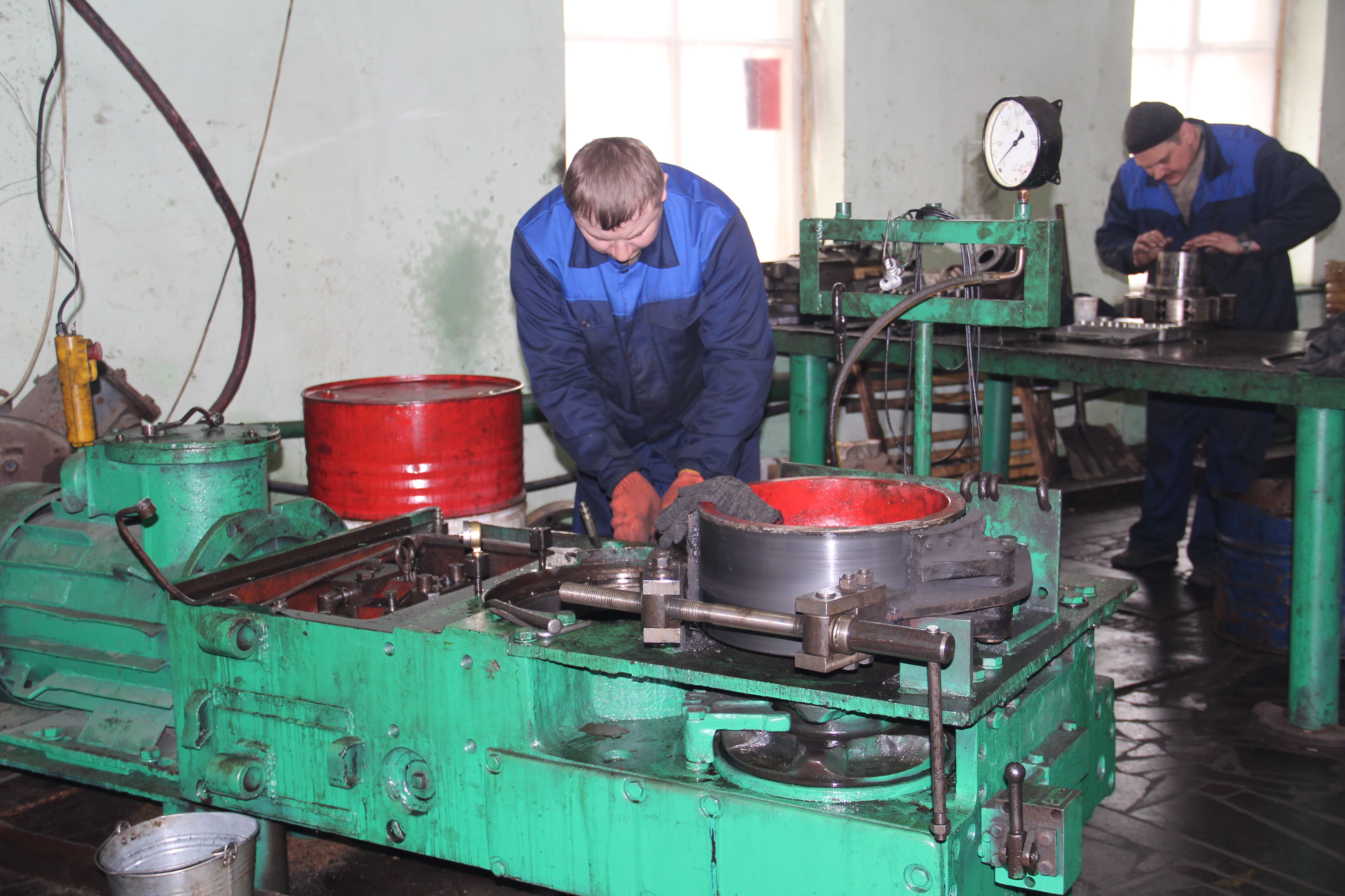 Мы ненадолго отвлекаем одного из рабочих – Юрий делает наплавку штока 3 КД-90, при этом разъясняет: «Сначала мы шток проточили, а потом делаем наплавку, то есть увеличиваем диаметр, и потому его снова нужно проточить». На вопрос «Какую роль играет песок, который просыпается на место плавки?», Юрий отвечает со знанием дела: «Это не песок, а флюс, защитная среда!». Мужскую профессию осваивают и некоторые женщины: Людмила работает наплавщицей 14 лет. «Работа очень интересная! На заводе работали отец, брат, поэтому я другой жизни не представляю» - утверждает работница, не отрываясь от станка.