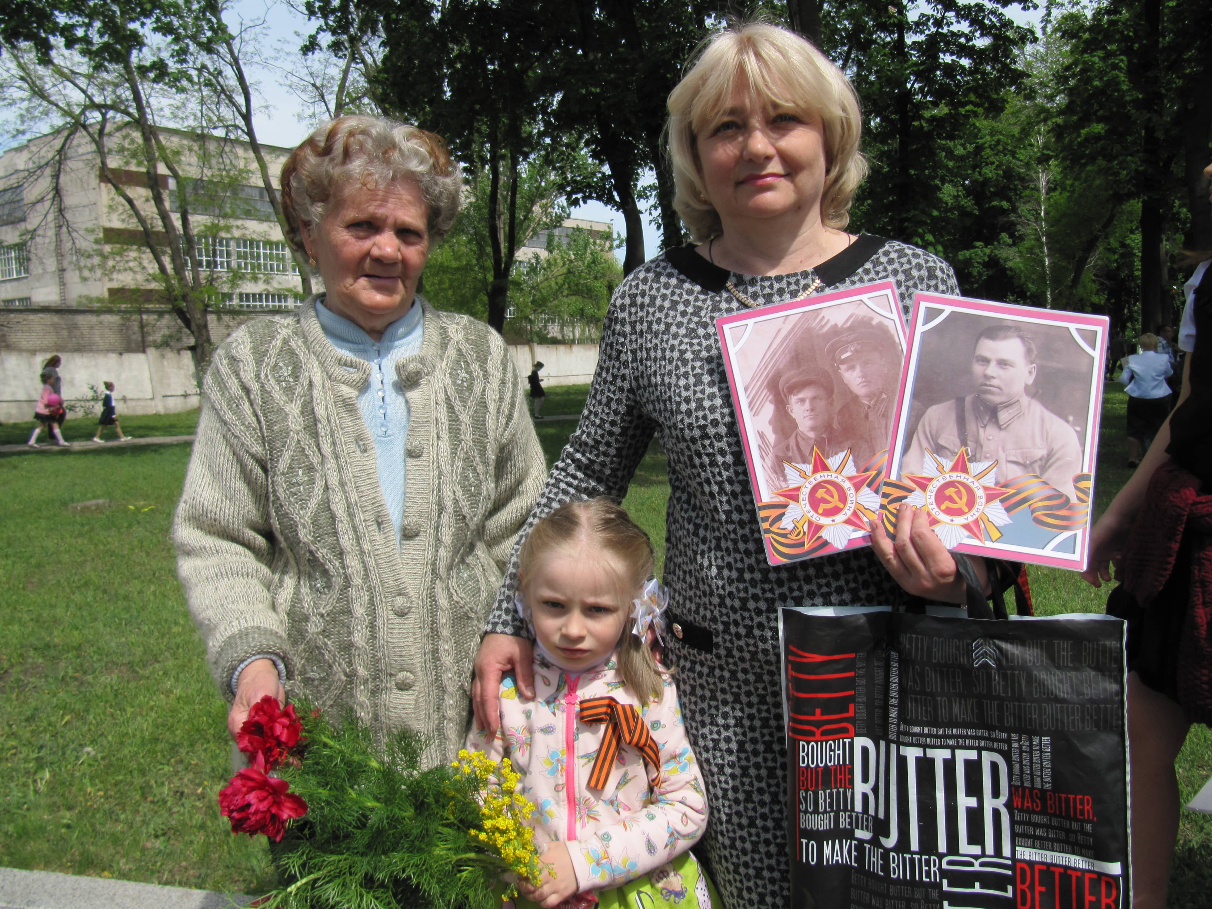 Мария Багой несла два портрета: дедушка Семен Кузьменко попал в плен где-то под Алчевском, а вот свекор Георгий Плиев получил тяжелое ранение в Новороссийске, и с войны пришел без одной ноги, но прожил до 80 лет. Владимир Евтухов участвовал не только в Великой Отечественной, но и в Гражданской и Финнской войнах.
