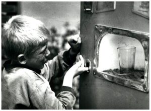 Деньги наши были на исходе, а пить ну уж очень хотелось. На выручку пришел наш уличный Кулибин. У него в кармане всегда была трехкопеечная монета с дырочкой, через которую он привязывал ее на тонкую леску. Надо было опустить монетку в щель для оплаты и, услышав щелчок быстро ее вытащить за леску. Автомат успевал сработать, а мы получали стакан бесплатной газированной воды с сиропом. Стакан был один на всех - толстостенный, граненный. К нему было особое отношение. Даже любители выпить за углом чего-нибудь покрепче, всегда возвращали его на место. В тот день мы пили газировку до тех пор, пока не начали икать.