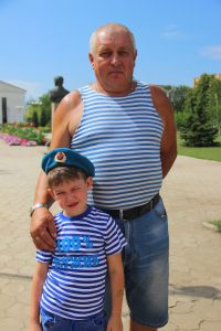 С.А. Бочаров, со своим внуком Ромой пришли к часовне, принять участие в митинге. По словам мальчика, он гордится тем, что его дед – десантник. Сам готовится стать таким же, уже отжимается от пола 30 раз. Сергей Александрович служил в опытной бригаде, горно-альпийской, созданной в 1973 г., Закавказского военного округа, в г. Кутаиси. «Годы службы1977-79 г., после отбора в военкомате г. Луганска: 10 раз подтянуться на турнике, 6 подъемов переворотом и полоса препятствий. Выбрали17 ребят из Свердловска. Большое спасибо нашему физруку В. А. Закутскому, который подготовил нас к службе. До сих пор помню его железную руку. До Армии занимался борьбой у Стоянова. Попали в 21 штурмовую бригаду. Имею 5 прыжков. Больше тренировали на зависание с вертолета, с высоты5-7 метров, нужно было спрыгнуть. «Захваты» перевалов, постоянные учения, подъем по вертикальной стене и т. д. Горная подготовка проходила недалеко от Ленинакана (Армения). Снаряжение было полностью горно-альпийское, обувь с шипами, панама. С друзьями до сих пор поддерживаю связь. Отец был морской пехотинец. По моему примеру младший брат и племянник служили ВДВ. Так что у нас династия. Слава ВДВ!»