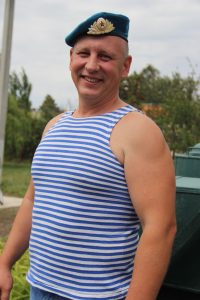 Олег Николаевич Богданов, улыбчивый, обаятельный, работает в полиции уже более 20 лет: годы службы – 1992-94 г. в Болградской воздушно-десантной дивизии, по военной специальности – командир автомобильного взвода. Прыжков было 10, из самолетов ИЛ-76 и АН-2 (учебные). «Первый раз ничего не знаешь, поэтому интересно, второй раз уже страшновато. А с третьего раза привыкаешь, начинаешь рассматривать окружающую красоту. Сейчас поддерживаю связь с армейскими друзьями. Начиналось все, здесь в городе. В 80-90гг. работал клуб «Синева», где мы, школьники, вместе с В. Домрачевым и А. Чекулдаевым, полностью подготовились к службе в Армии. На сегодняшнем празднике ребята, которые хотят стать десантниками, совсем такие же, какими были мы. Это очень приятно и радостно. Хочу, чтобы мой сын стал десантником. Но только в мирное время. Сегодня праздник такой большой, что лучше, чем Новый год!»
