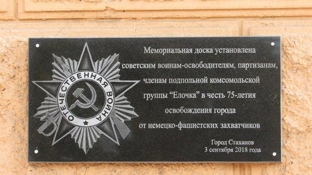 В честь 75-й годовщины освобождения Стаханова от немецко-фашистских захватчиков в городе на здании историко-художественного музея открыли мемориальную доску советским воинам-освободителям, партизанам, членам подпольной комсомольской группы "Елочка".