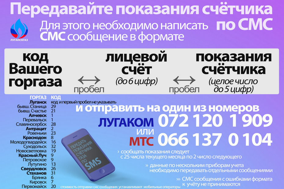 В СМС-сообщении нужно через пробел указать: код обслуживающего горгаза, номер лицевого счета (до шести цифр) и показания счетчика газа (целое число до пяти цифр). Для абонентов, которых обслуживает Луганский участок ГП "Луганскгаза", код горгаза и первый пробел в СМС-сообщении не указывается.