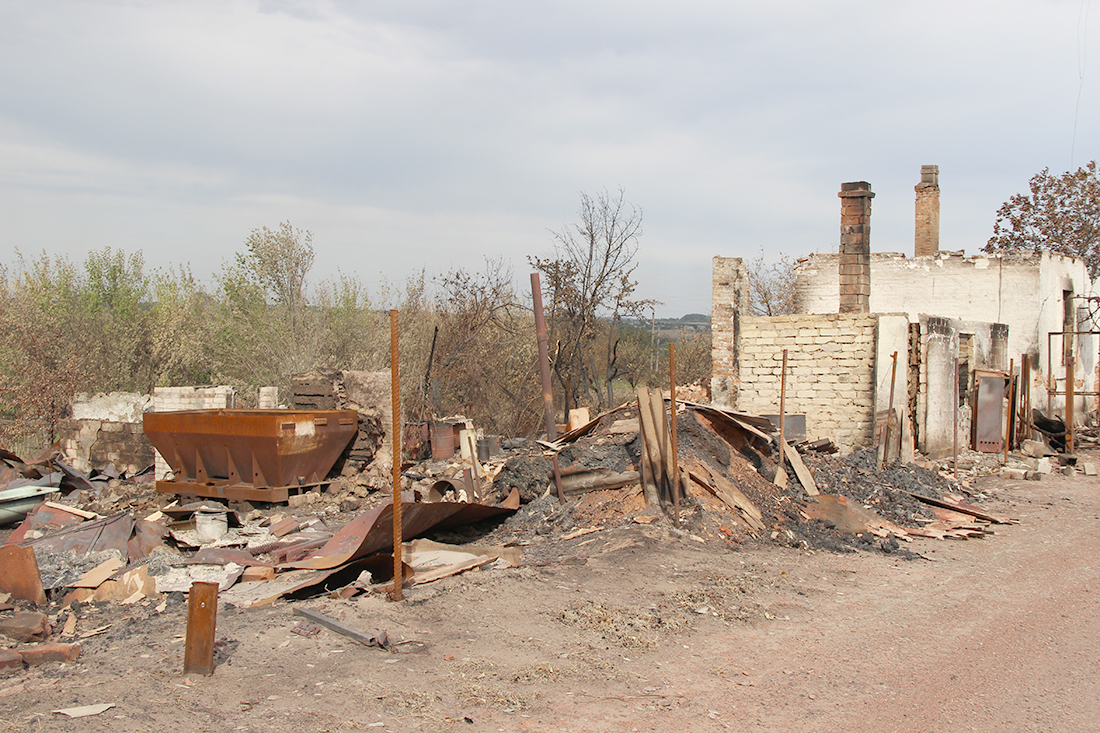 Всего в нескольких километрах от поселка Краснодон перед нами раскинулись черные поля. Сухая трава горела почти везде. То тут, то там проглядывали одинокие почерневшие деревья. С их крон свешивались пожухлые листья. Выжженная земля простиралась везде, где мог ухватить взгляд.