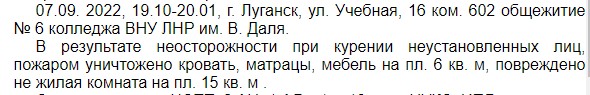 Сообщается, что в общежитии № 6 колледжа ВНУ ЛНР им. Владимира Даля в результате неосторожности при курении неустановленных лиц пожаром уничтожены кровать, матрацы, мебель, повреждена не жилая комната.