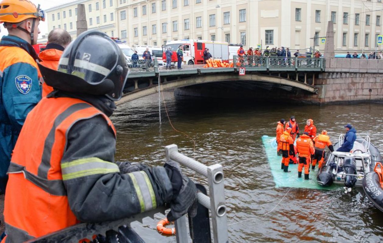 По данным ведомства, автобус попал в ДТП, а затем упал с моста в реку Мойку и утонул, в салоне находилось около 20 человек.