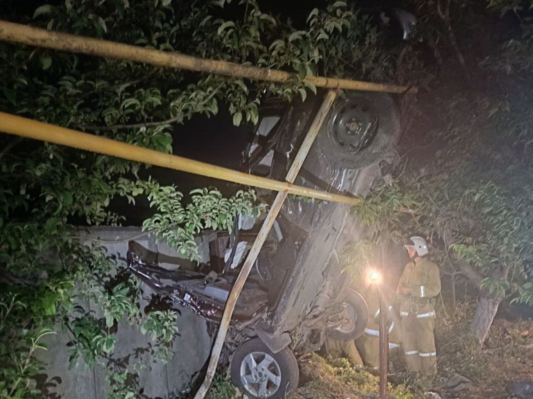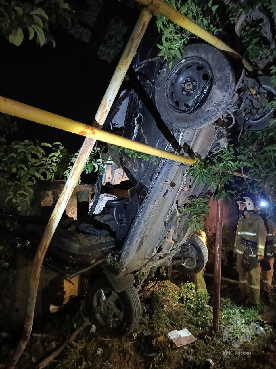Судя по опубликованным снимкам, авто превратилось в груду металла в результате падения с высоты. Машина приняла вертикальное положение, опершись о газовую трубу.