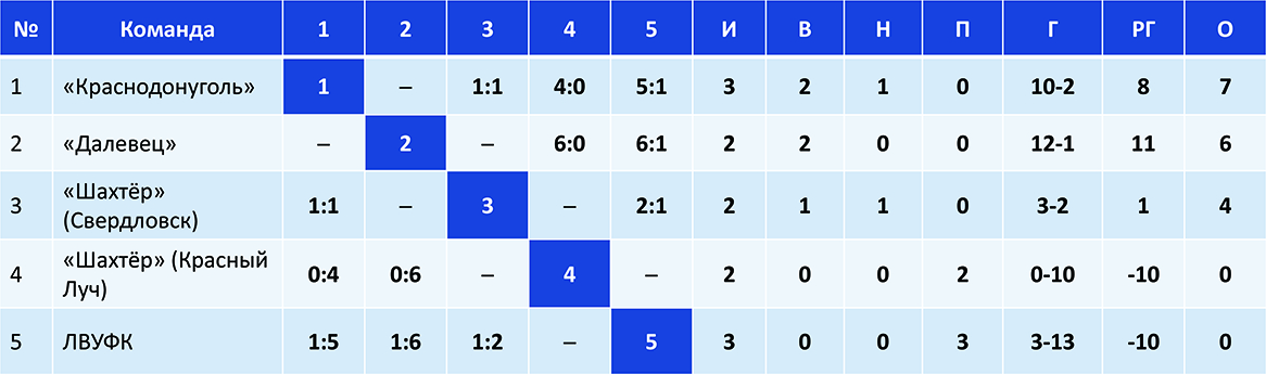 Четвертый тур Кубка – 21 апреля наша команда пропустила. Футболисты отдыхали и набирались сил перед игрой с серьезным соперником – 28 апреля в пятом туре «Краснодонуголь» встретится с «Далевцем». Этот тур определит две сильнейшие команды группы «А», которые пройдут в полуфинал Кубка ЛФС. Пожелаем нашим футболистам удачи и выхода в полуфинал игр.