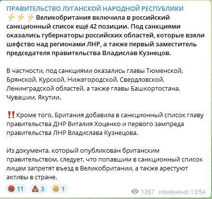 Великобритания включила в очередной санкционный список 42 политика из России, ими оказались губернаторы российских областей, которые взяли шефство над регионами ЛНР, а также первый заместитель председателя правительства Владислав Кузнецов.