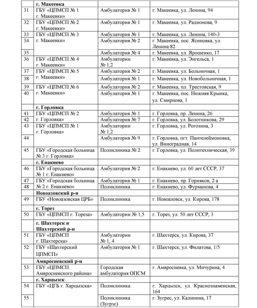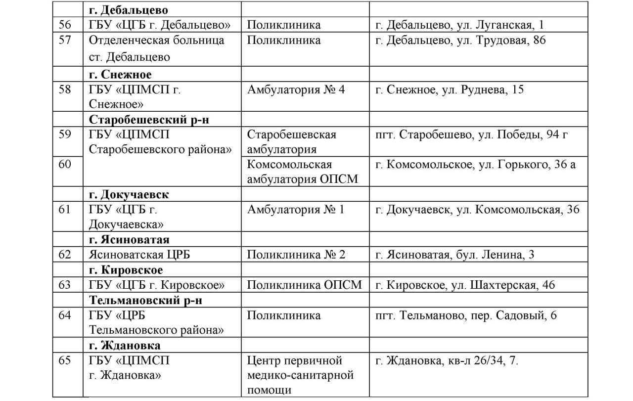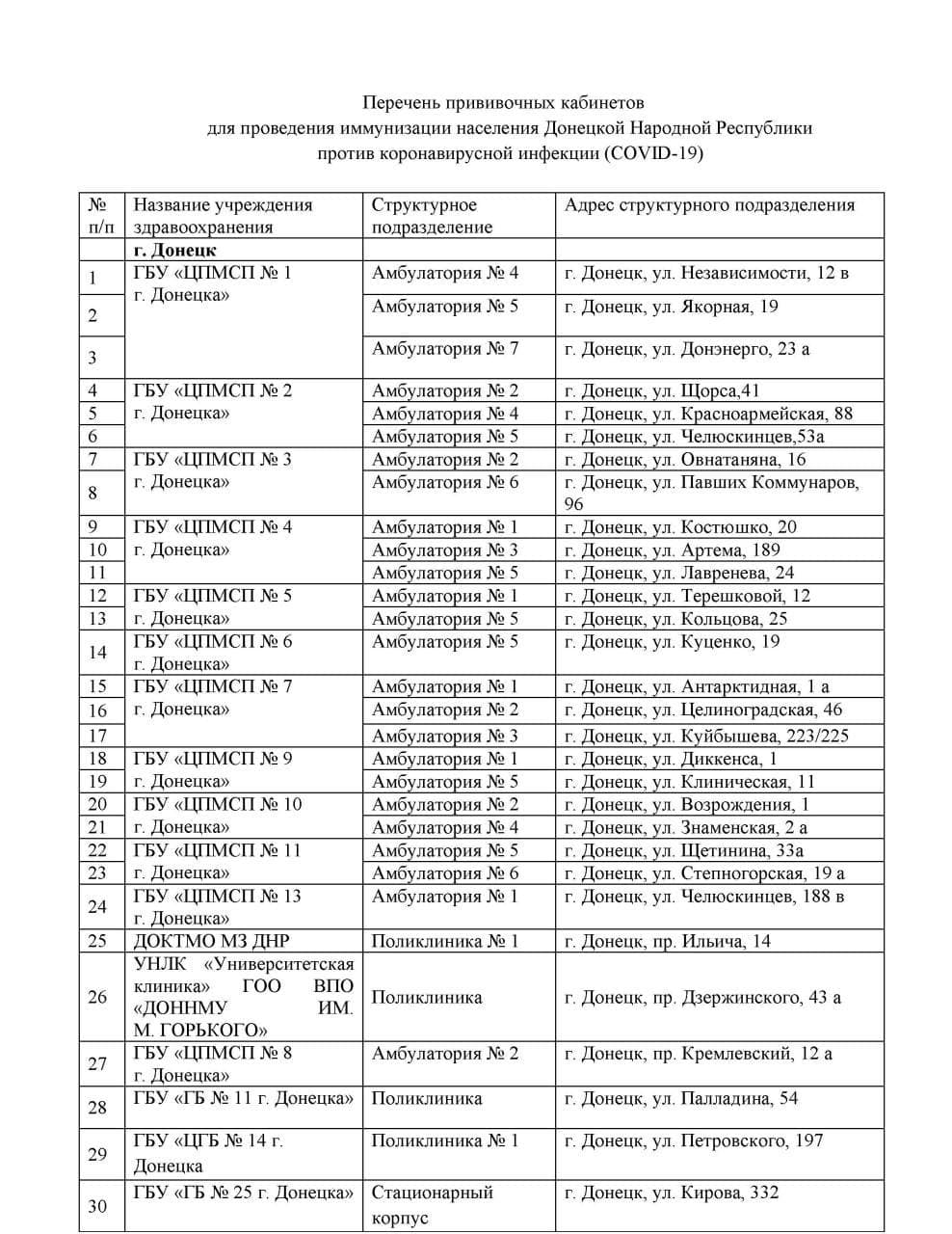 На сегодняшний день в республики развернуто 65 прививочных пунктов. Согласно списку, кабинеты вакцинации есть в 17 городах и поселках. В Донецке работают 30 пунктов, в Макеевке – 10, Горловке – пять, остальных населенных пунктах – один-два пункта вакцинации. До этого таких пунктов было более полусотни.