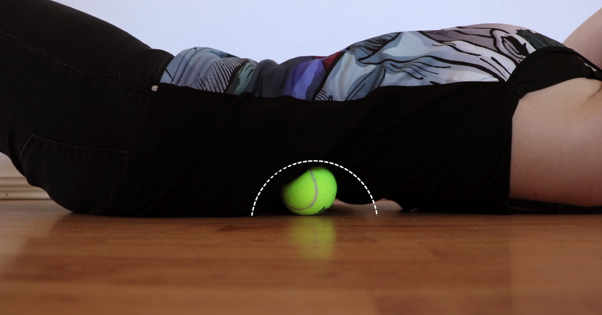 Найдите ровную поверхность и лягте на спину. Положите под крестец теннисный мяч. Побудьте в этом положении несколько минут. При этом допустим лёгкий дискомфорт. Если дискомфорт сильный, немного приподнимитесь за счёт предплечий. Медленно и аккуратно прорабатывайте позвоночник, перекладывая мяч понемногу вверх, вплоть до основания шеи. Таким образом вы проработаете крестец, поясницу и грудной отдел. Если у вас не возникло никаких ощущений в зоне остановки, то перемещайте мяч вверх по позвоночному столбу, не останавливаясь. Задержитесь немного дольше в тех областях позвоночника, где вы почувствовали наибольший дискомфорт. Потратьте на них не две-три минуты, а пять. Так вы окажете мягкую компрессию (надавливание) и усилите кровоток в данной зоне, что улучшит общую подвижность позвоночника.