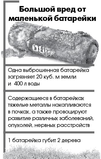 Использованные пальчиковые батарейки можно помещать в баки, предназначенные для ТБО. В том случае, если по весу они не превышают килограмма, их разрешается выкидывать в бак. В противном случае их надо отдельно собирать и утилизировать. А вот аккумуляторные батарейки уже нельзя выкидывать в мусорный контейнер, и в республике никто не занимается их переработкой.