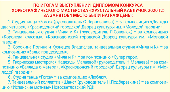 По итогам конкурса хореографы получили заслуженные награды. Будем надеяться, что в следующем году это мероприятие пройдет в традиционном формате, радуя участников и зрителей атмосферой праздника.