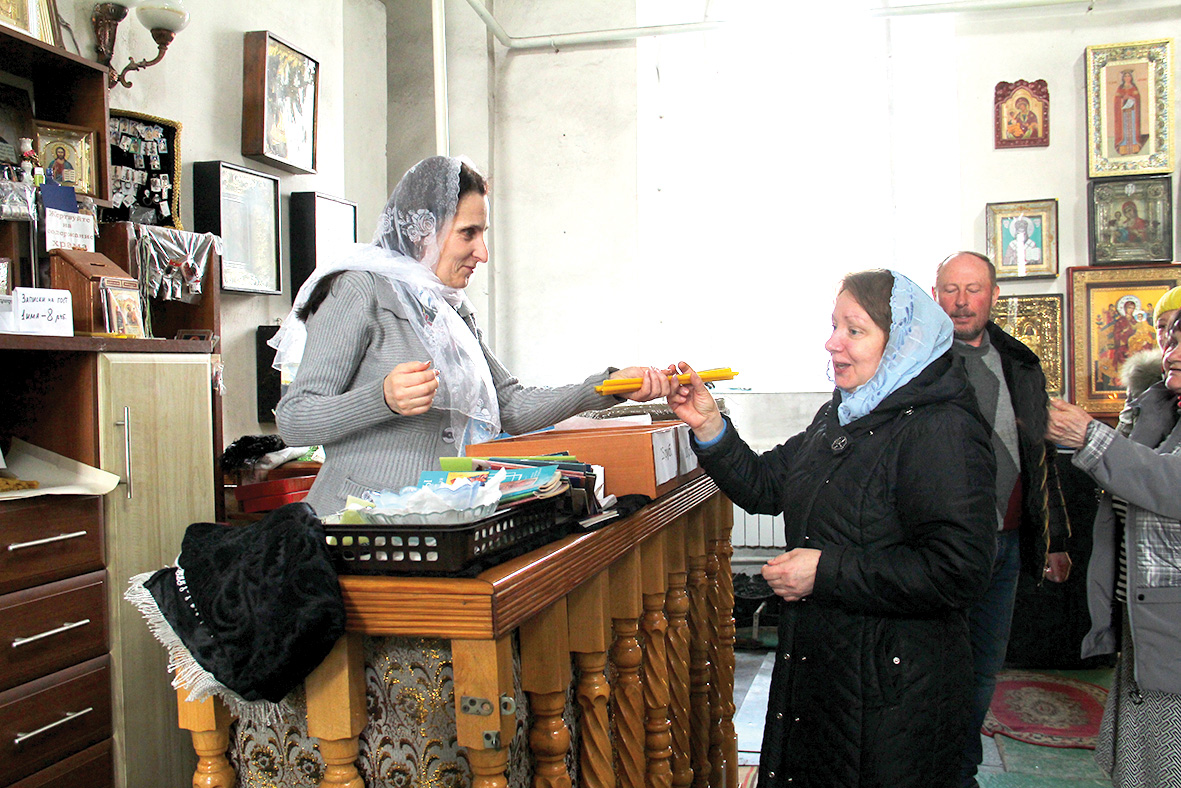 Одной из нас разрешили подменить свечницу. Это первый человек, которого мы встречаем, переступив порог храма. Формально он продает церковные товары, принимает поминальные записки. И отвечает на самые разные, иногда довольно странные или очень банальные вопросы, например: «У вас есть икона для богатства?», «А как заказать молебен?». Чтобы заниматься этим делом, особыми талантами обладать не обязательно, и коллега с этим справилась в два счета.