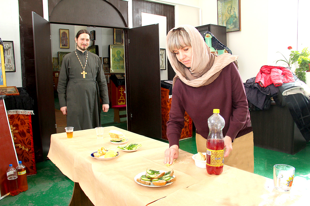 Кроме этого, в храме много другой работы, как и дома. Так, по завершении службы, прихожан ждал благотворительный обед. Пока Лиля продавала и тушила свечи, я отправилась помогать накрывать на стол. Мне отворили плотно закрытую дверью, за которой активно суетились женщины. Кто-то из них пересчитывал посуду по количеству пришедших, другие нарезали хлеб, овощи, фрукты. И, несмотря на то, сейчас идет строгий пост, в этот день допускаются значимые послабления: разрешается вкушать рыбу и в умеренном количестве вино. Поэтому обеденный стол был полон: уха, овощной плов, запеченная скумбрия на костре.