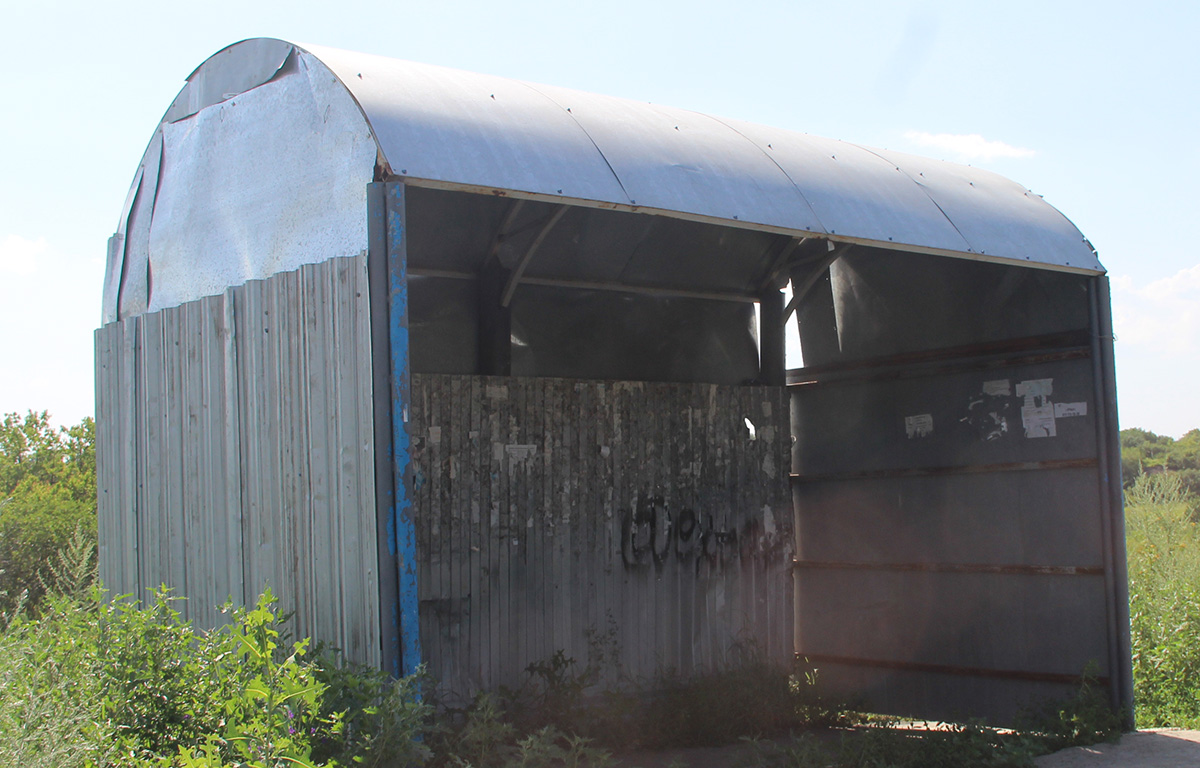 Не нужно быть утонченным эстетом, чтобы оценить остановку из профильного листа на «Должике», которая напоминает склепанный наспех увеличенный макет собачьей будки. Появился этот шедевр местного зодчества пару лет назад, так что, возможно, его подавали как новомодные веяния в строительстве мест ожидания в регулярных перевозках. Однако даже проезжающие мимо автомобилисты отмечают, что у ее создателей руки растут не из плеч. Потому, что пришпандоривали господа строители листы оцинкованного железа разного калибра к каркасу по особенной, понятной только им технологии. Вдоль угловых соединений щели размером в две ладони – самое безобидное, чем порадовали мастера ожидающих пассажиров. В зазоры остальных стыков, расположенных в верхней части, пролезет не только рука, но и нога. Пока стоит жара, они безобидны, даже могут быть полезными, выполняя роль вентиляции, однако можно представить, как стружит в ухо зимой из огромной дыры. Расположена остановка в чистом поле, так что заросла травой по колено, причем растительность наблюдается и в самом помещении. Кроме декорации полевыми цветами, внутри местные художники опробовали «наскальную живопись».