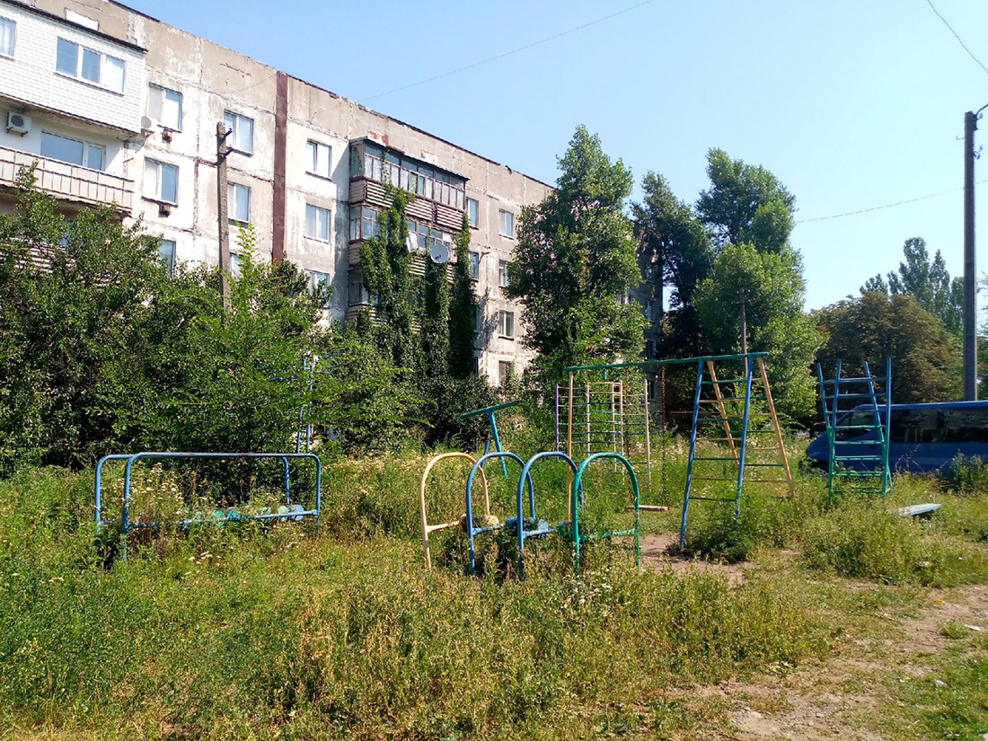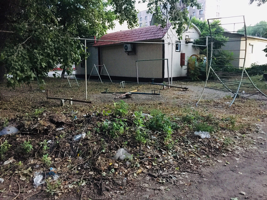 Площадка на квартале Пролетариата Донбасса, 61 сразу же привлекает внимание огромными зарослями на ней. Признаться честно, даже проходить мимо нее страшновато, ведь кажется, что оттуда ктонибудь выскочит. А кусты амброзии, к тому же, могут вызвать аллергию. Сложно представить, как там могут играть дети. Скорее всего, для этого они выбирают другие места.