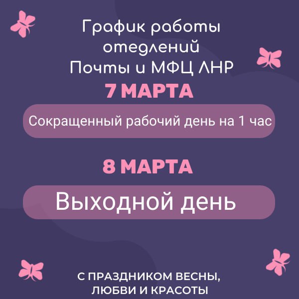 Министерство связи и массовых коммуникаций ЛНР опубликовало график работы отделений МФЦ в ЛНР и центров обслуживания абонентов МКС в период празднования Международного женского дня.
