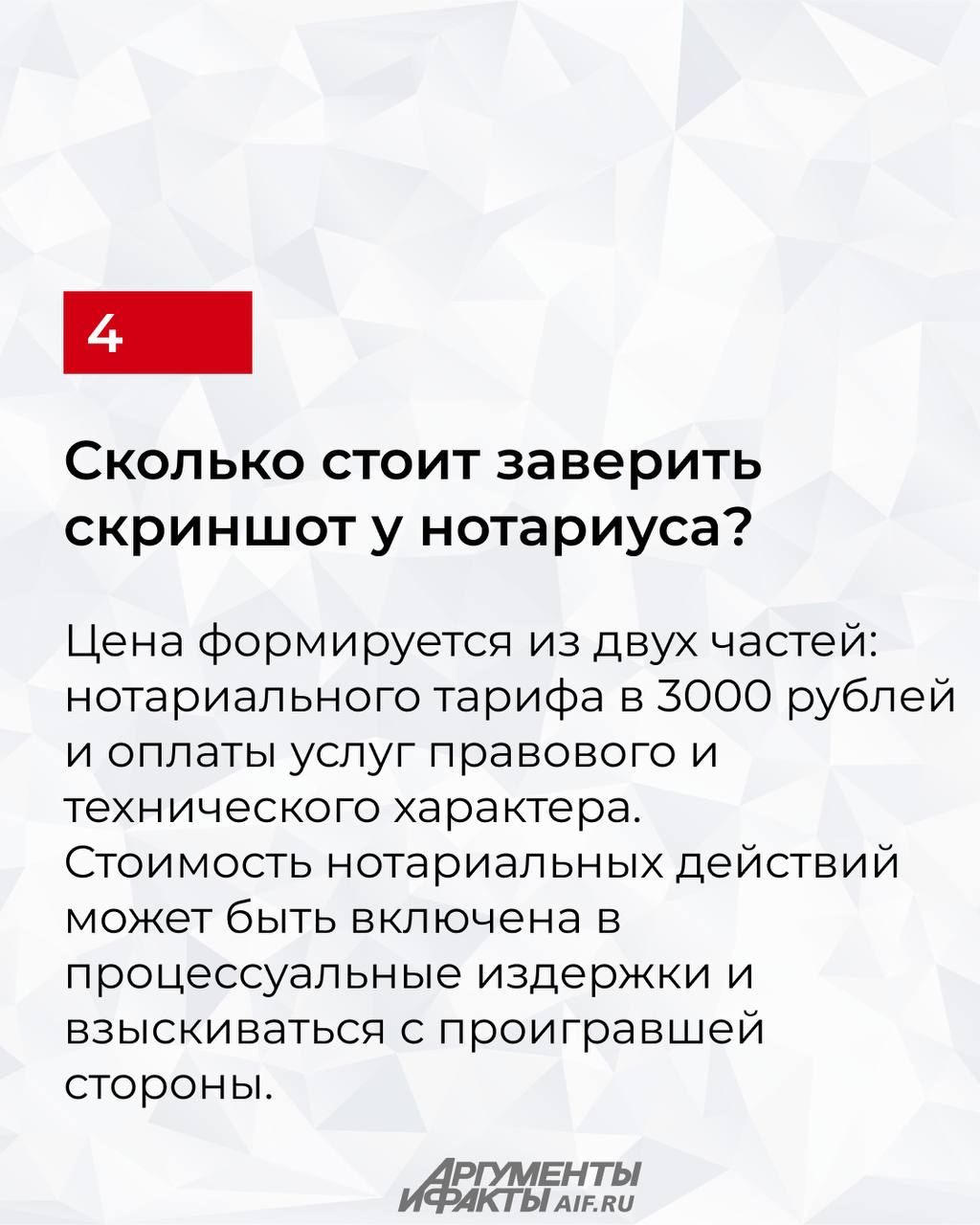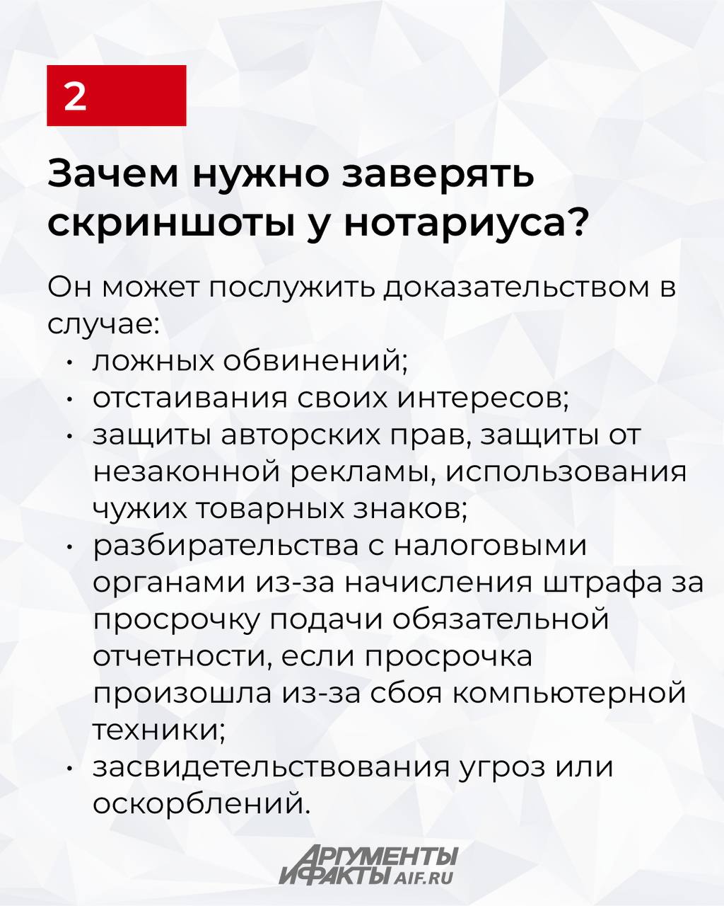 Телеграм-канал «Аргументы и Факты — АиФ.ru» опубликовал соответствующие карточки, в которых россиянам разъяснили для чего и как заверить скриншот у нотариуса.