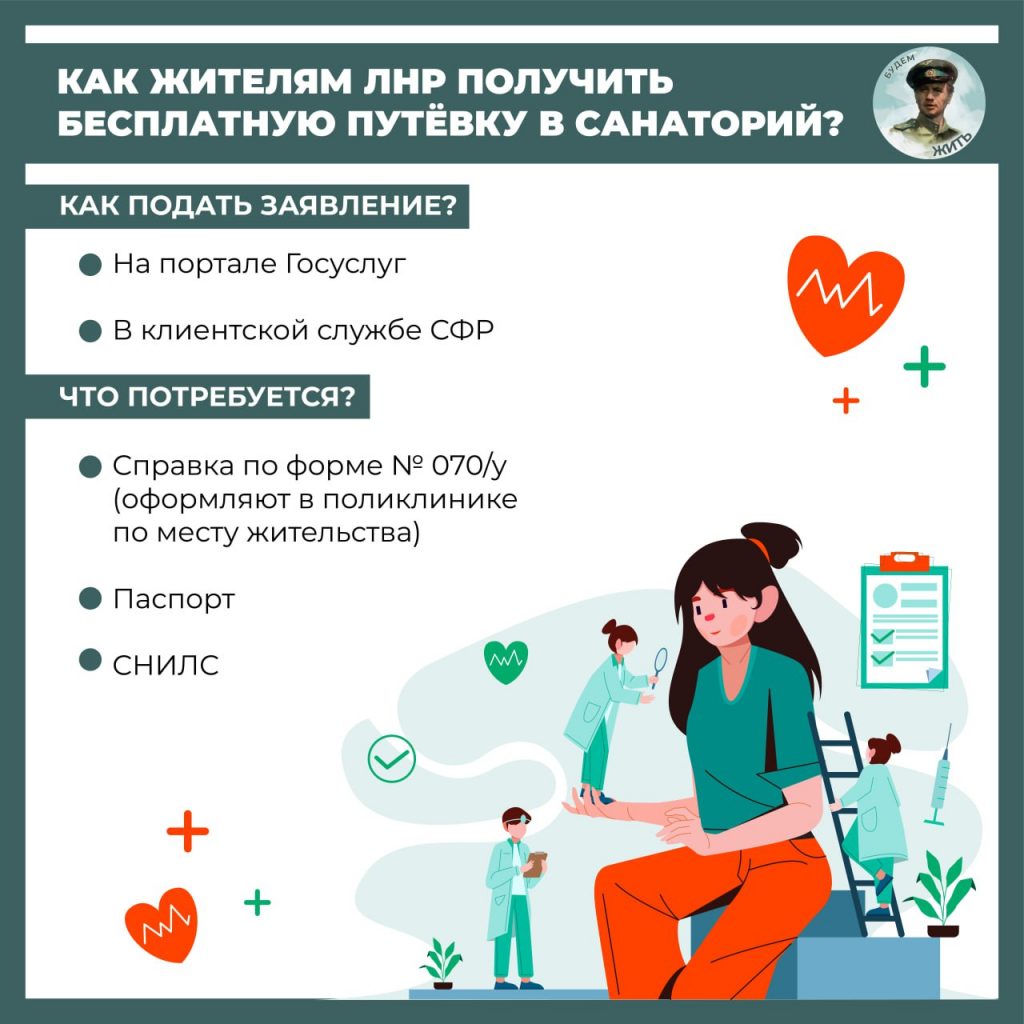 Право на путёвки имеют льготные категории граждан, включенные в федеральный регистр: граждане с инвалидностью, ветераны, чернобыльцы. Для того, чтобы получить путёвку необходимо обратиться в клиентскую службу Социального фонда России по ЛНР и предоставить пакет необходимых документов: