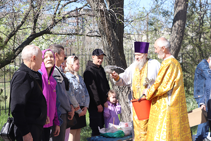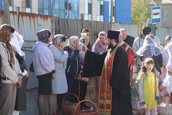 К девяти утра поток людей, направляющихся в церкви Краснодона, заметно уменьшился, но во дворе Свято-Благовещенского храма их было все еще много. Радуясь прекрасной погоде в такой светлый праздник, они ждали, когда настоятель храма, протоиерей Дмитрий Притула окропит святой водой их и корзины с продуктами.